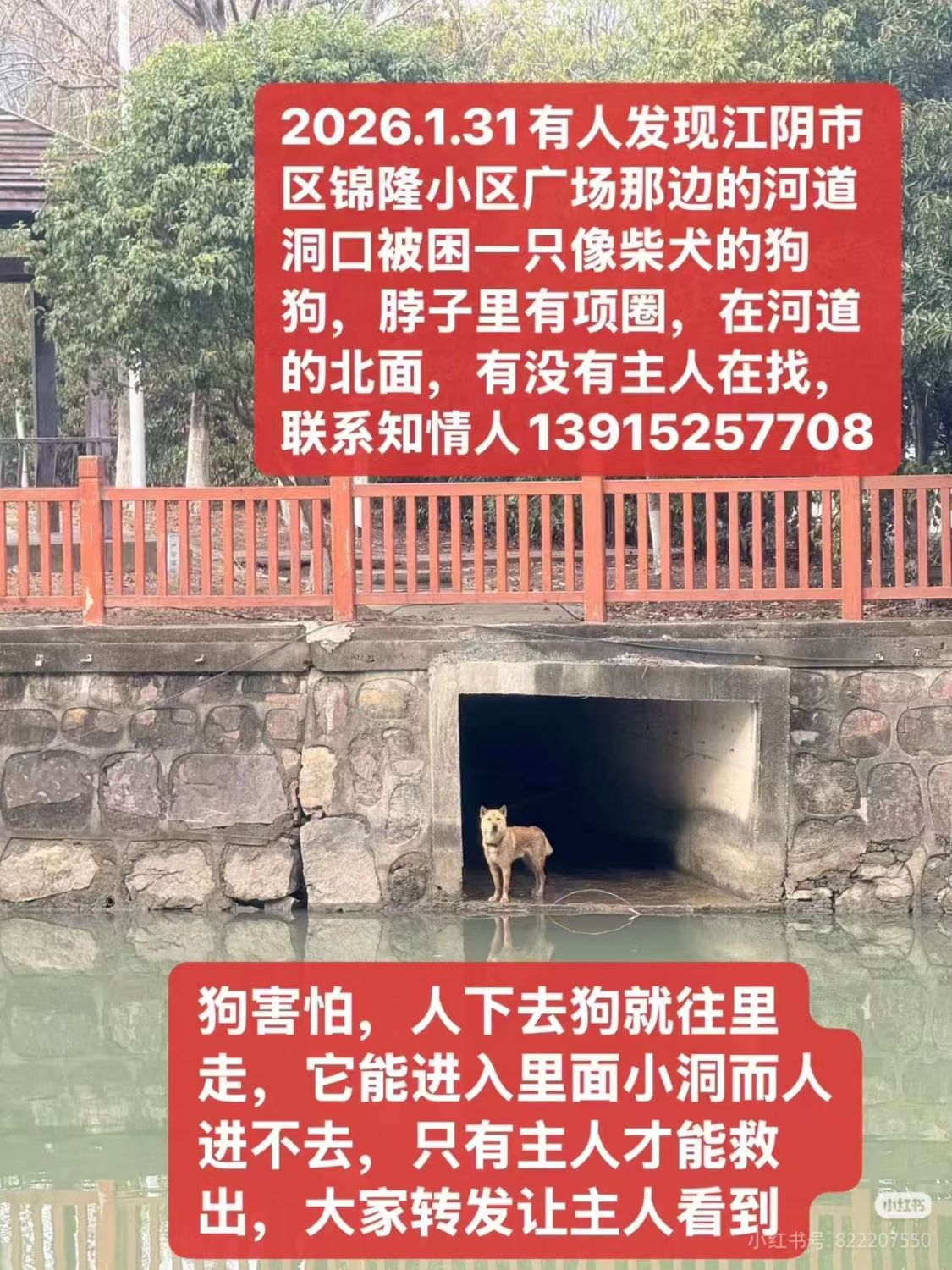 2026.1.31有人发现江阴市区锦隆小区广场那边的河道洞口被困一只像柴犬的狗...