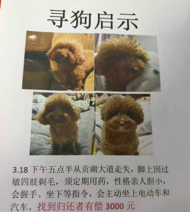 3.18下午五点半从贡湖大道走失,脚上因过敏四肢剃毛,须定期用药,性格亲人...